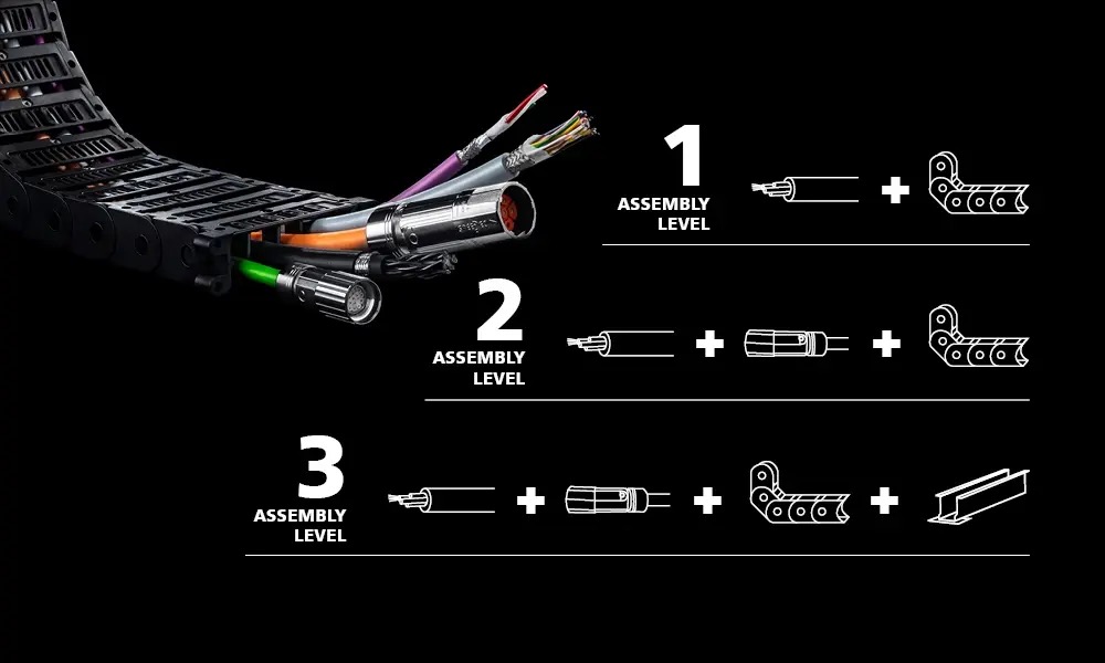 Assemblageniveau 3 bestaat uit een voorgemonteerde kabel, een energieketting en aanvullende accessoires.