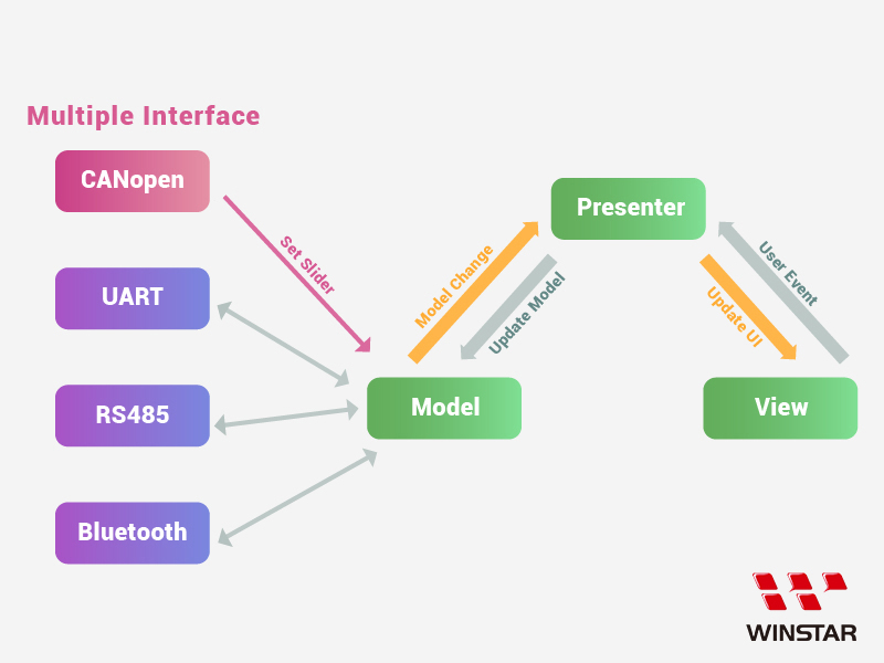 Through lower-level processing for different interfaces (eg, CAN bus, RS485, UART, Bluetooth, Wi-Fi), data is forwarded to the Model for communication and then relayed to the View via the Presenter, achieving object status switching.