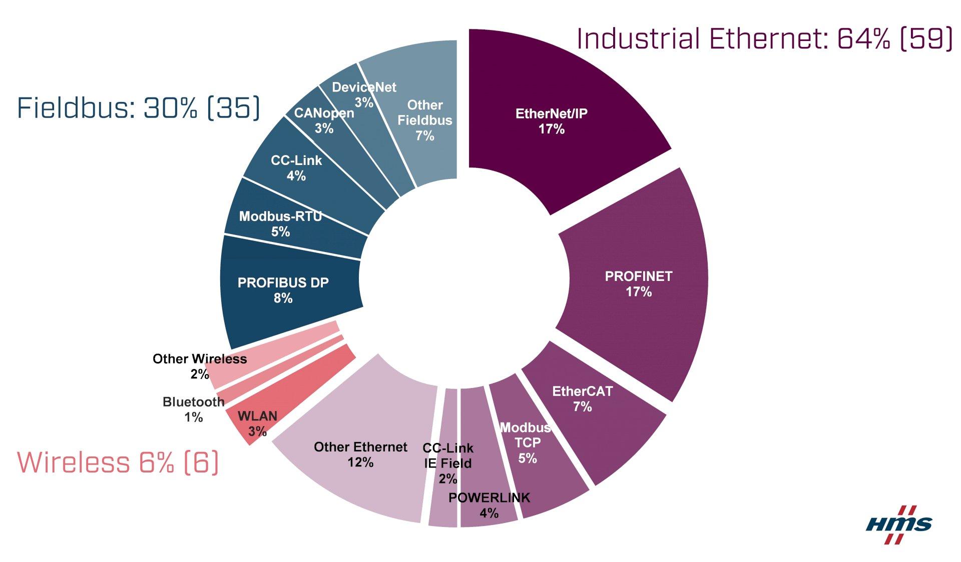 In de studie concludeert HMS dat Industrial Ethernet marktaandeel van de veldbussen blijft afsnoepen. Industrial Ethernet is nu goed voor 64% van de wereldwijde markt van nieuw geïnstalleerde nodes in de fabrieksautomatisering (vergeleken met 59% vorig jaar). EtherNet/IP en PROFINET delen de eerste plaats met elk een marktaandeel van 17%. EtherCAT blijft wereldwijd goed presteren met 7% en Modbus-TCP passeert met 5% net Ethernet POWERLINK met 4%.