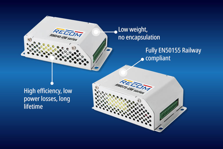 RECOM has announced two new cost-efficient DC/DCs for the rail market with an ultra-wide 11:1 input range to cover all nominal input voltages from 24V to 110VDC, with 24V output and a 12V and 15V output version coming soon. Models RMD40-UW and RMD75-UW have trimmable outputs with reinforced isolation, rated at 40W (60W/10s boost) and 75W (90W/10s boost) respectively. The parts are offered as lightweight baseplate-cooled modules and thanks to their high conversion efficiency of better than 90%, they can operate at full power for OT4+ST1&ST2 classes from -40°C to +85°C with no additional cooling in any mounting position.