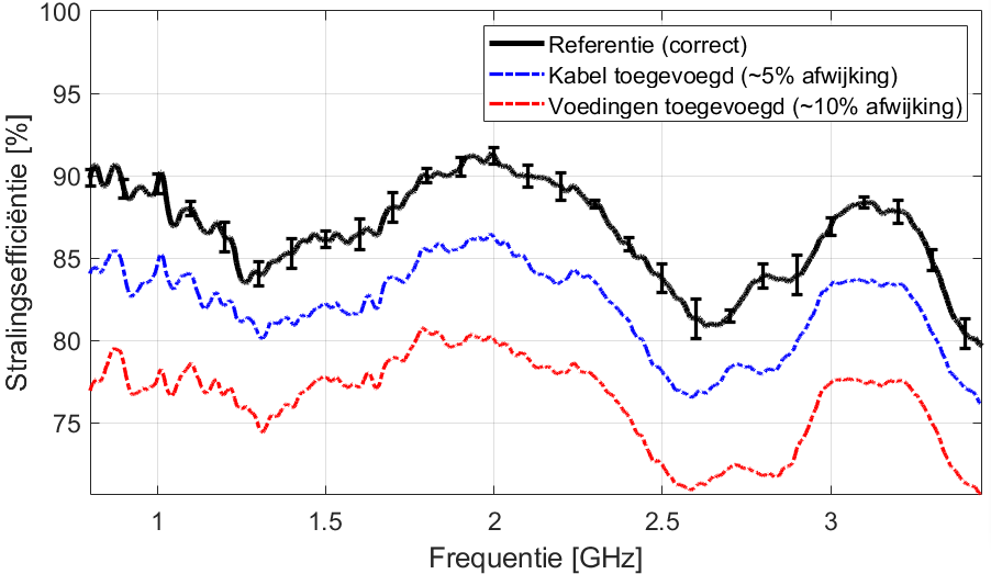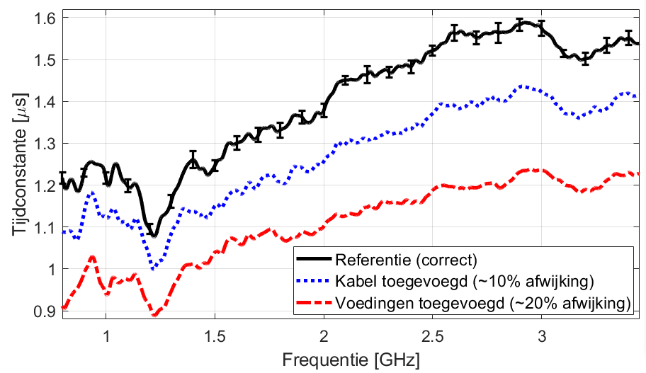 Een goed voorbeeld dat laat zien hoe snel zo’n meting beïnvloed kan worden is te zien in Figuur 2 [1]. Daar is drie keer dezelfde meting uitgevoerd, waar bij de tweede en derde meting een simpele (niet aangesloten) stroomkabel en enkele voedingen in de kamer zijn geplaatst, waarbij we ervan uitgaan dat die er niet liggen. Dit klinkt gek, maar in veel instituten is het een standaardprocedure om de verliezen in de ruimte van tevoren één keer te bepalen, om vervolgens apparatuur erin te plaatsen die nodig is om bijvoorbeeld een actieve antenne te meten. Als gevolg zijn de verliezen dus eigenlijk hoger dan je zou verwachten. Die verliezen in de kamer definiëren we met behulp van de ‘tijdconstante’. Deze laat zien voor hoeveel tijd een golf blijft reflecteren in de kamer, totdat deze dermate afgezwakt is dat deze in de ruisvloer beland is. Dit is vaak enkele microsecondes, wat gelijk staat aan meerdere kilometers in de kamer [4]. In Figuur 3 is goed te zien dat deze tijdconstante erg gevoelig is voor de aanwezigheid van extra apparatuur. Als daar geen rekening mee gehouden wordt, kan je gemeten efficiëntie met 5% afwijken met de aanwezigheid van een kabel, en wel 10% met een paar voedingen (deze konden niet buiten de kamer geplaatst worden) die gebruikt werden voor de aansturing van een antenne, zoals te zien is in Figuur 2. Dit is veel meer dan de standaard meetonzekerheid, die aangegeven is met de foutbalken op de referentiemeting.