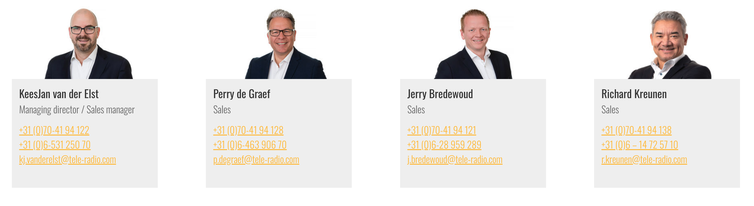 Tele Radio is door haar omvang een belangrijke partner voor fabrikanten, distributeurs en eindgebruikers. Door ons wereldwijde netwerk van eigen ontwikkelingscentra, fabrieken en verkoopkantoren kunnen wij zorgdragen voor hoge productievolumes, productaanpassingen volgens de wens van de klant of maatwerk in kleine hoeveelheden. Meer dan 25 eigen verkoopkantoren staan voor u klaar in Europa, Amerika, Azië en Oceanië.